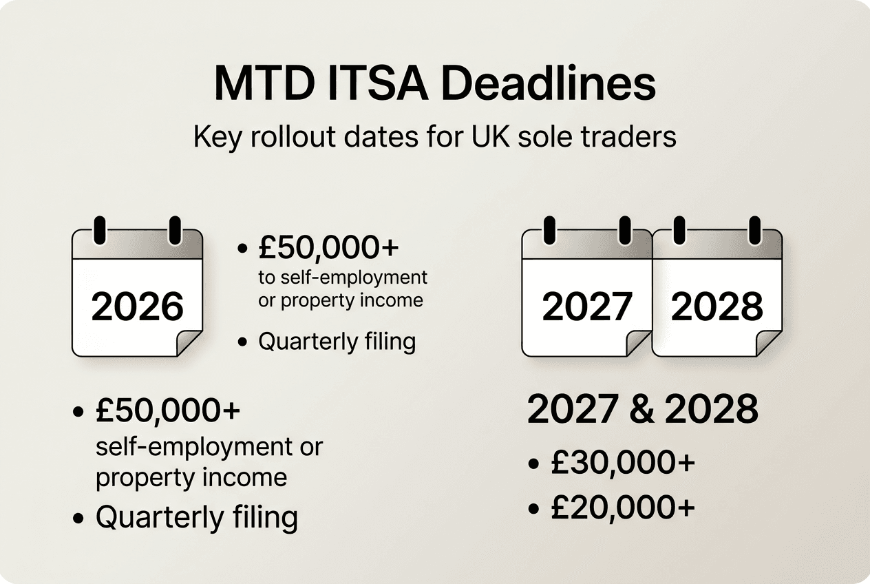 | MTD ITSA starts 2026 | Sole traders and landlords earning over £50,000 must submit quarterly digital updates from April 2026 |